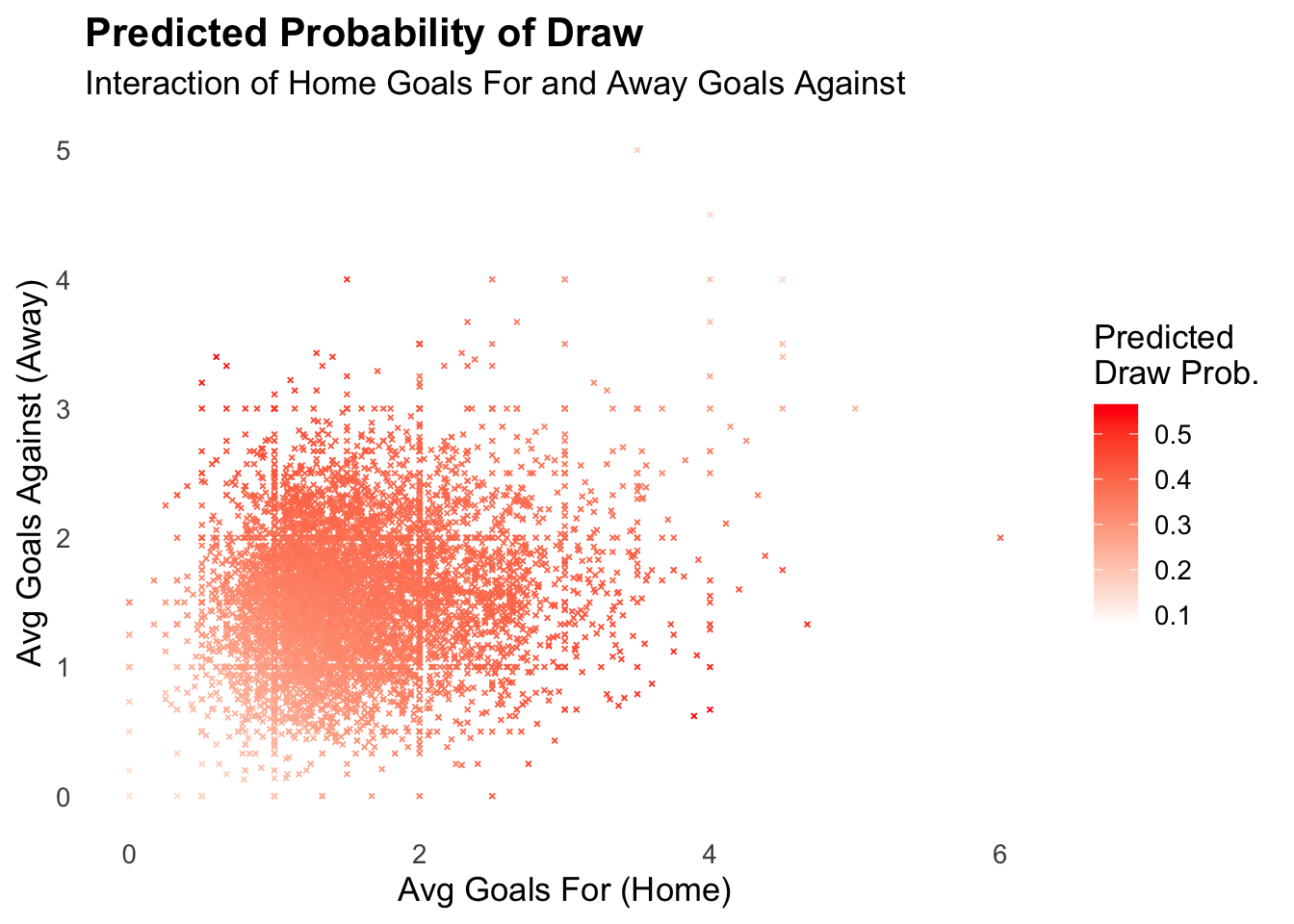 The home team’s average goals against and the away team’s average goals for are not good predictors for draws! Let’s work this into a model that includes an interaction effect.