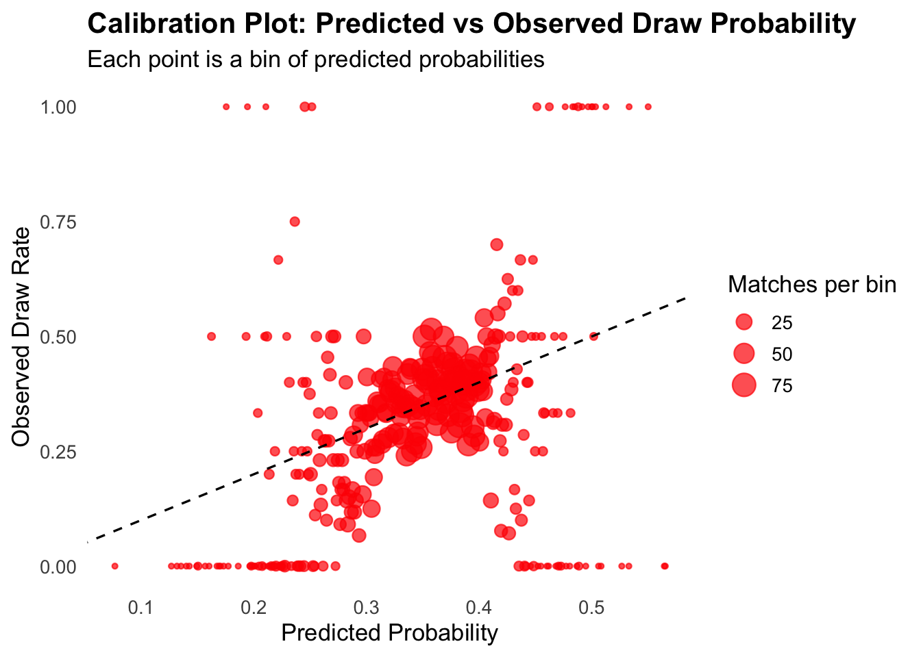 The visual paints a picture of predicted vs actual draws with broad brushes. Importantly the diagonal line represents the line of perfect calibration where predicted = observed. So ideally all dots line up on that line. Visually I notice: